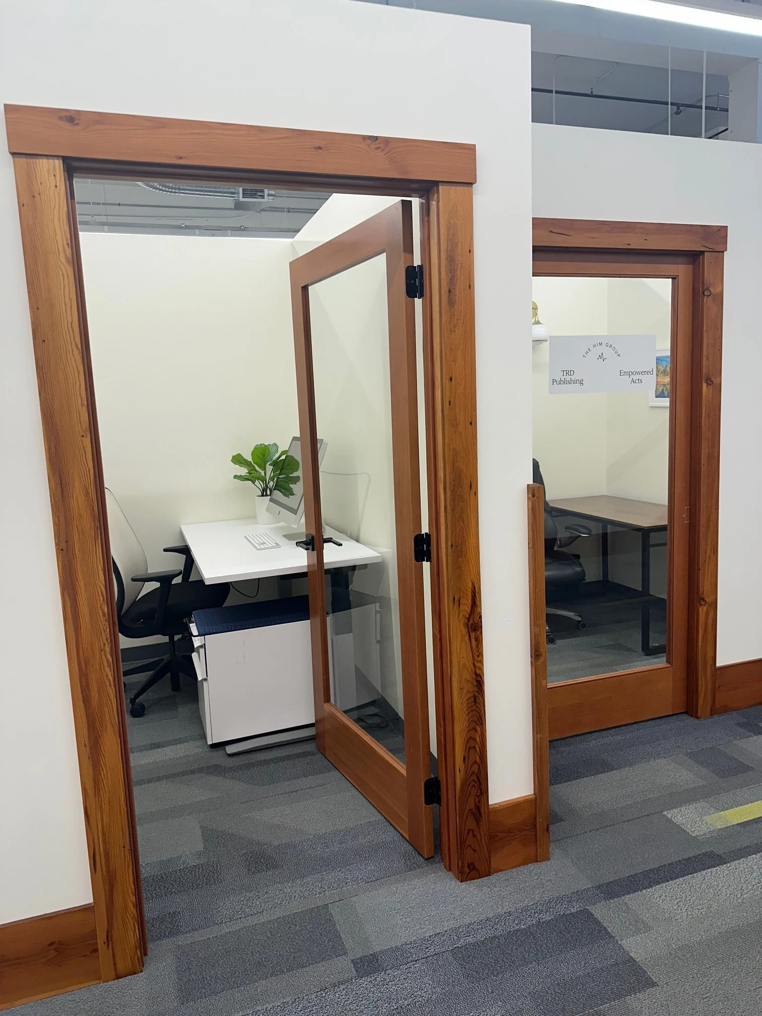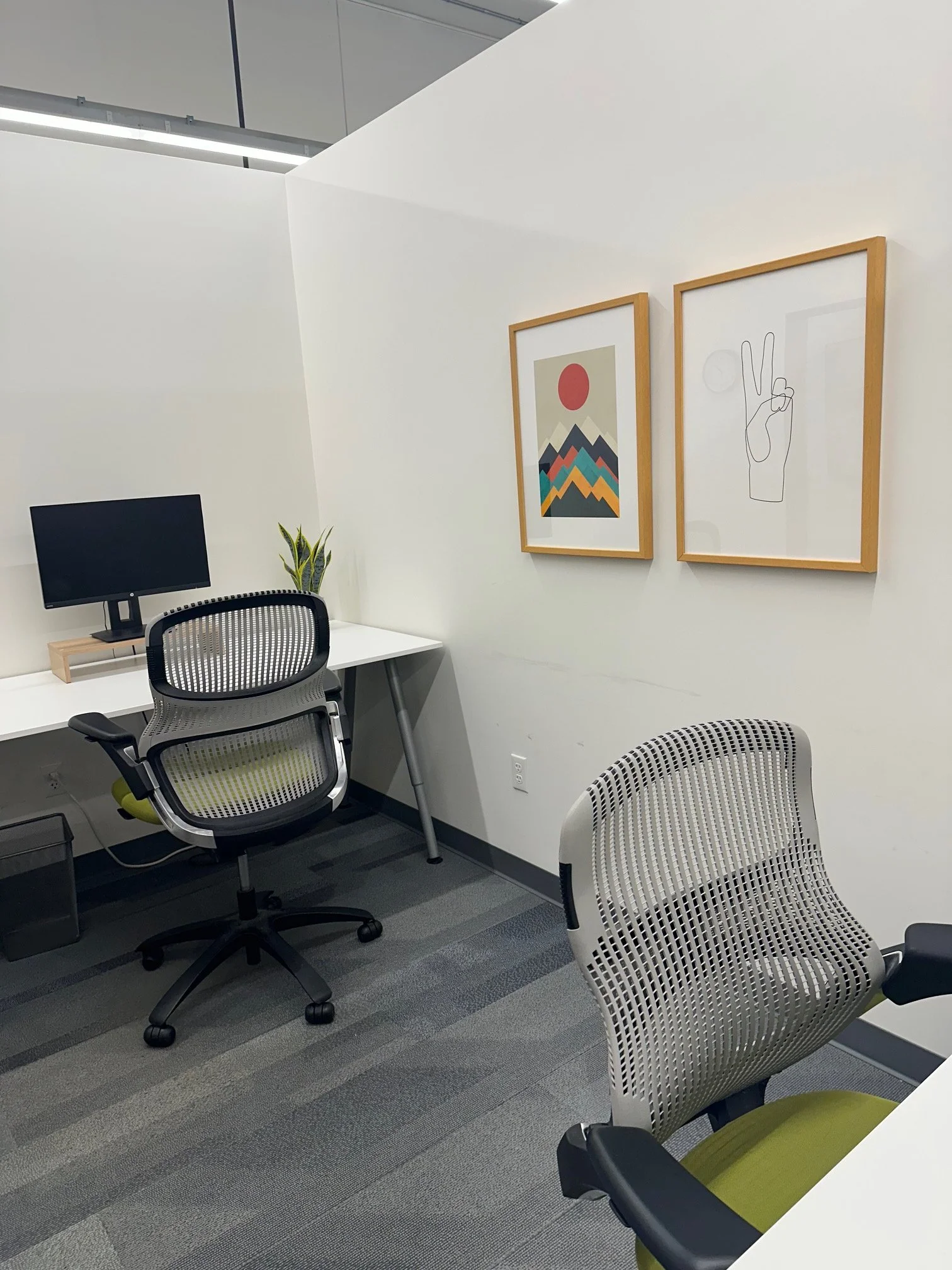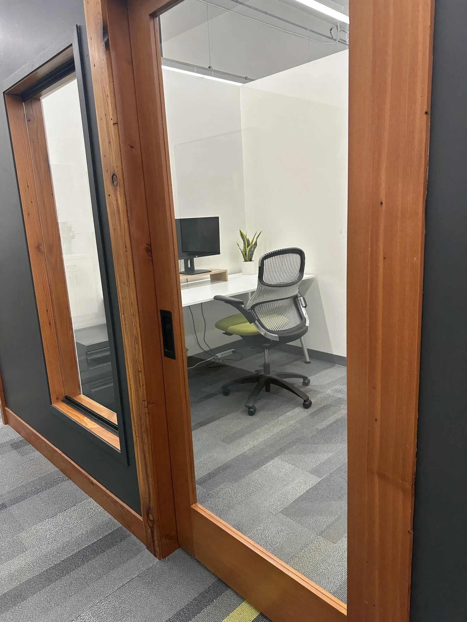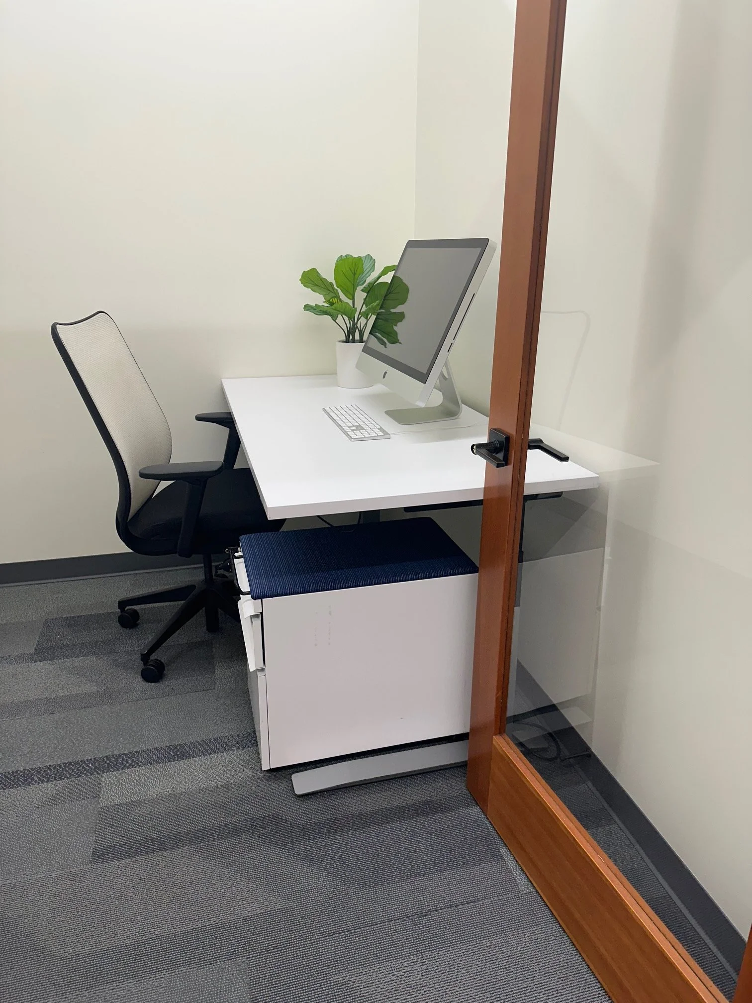 This furnished private office offers a clean, efficient, move-in-ready workspace ideal for one person. The office includes a desk, ergonomic chair, and a glass door that brings in natural light while maintaining privacy. Offered at $500 per month with a 1-year lease term.
