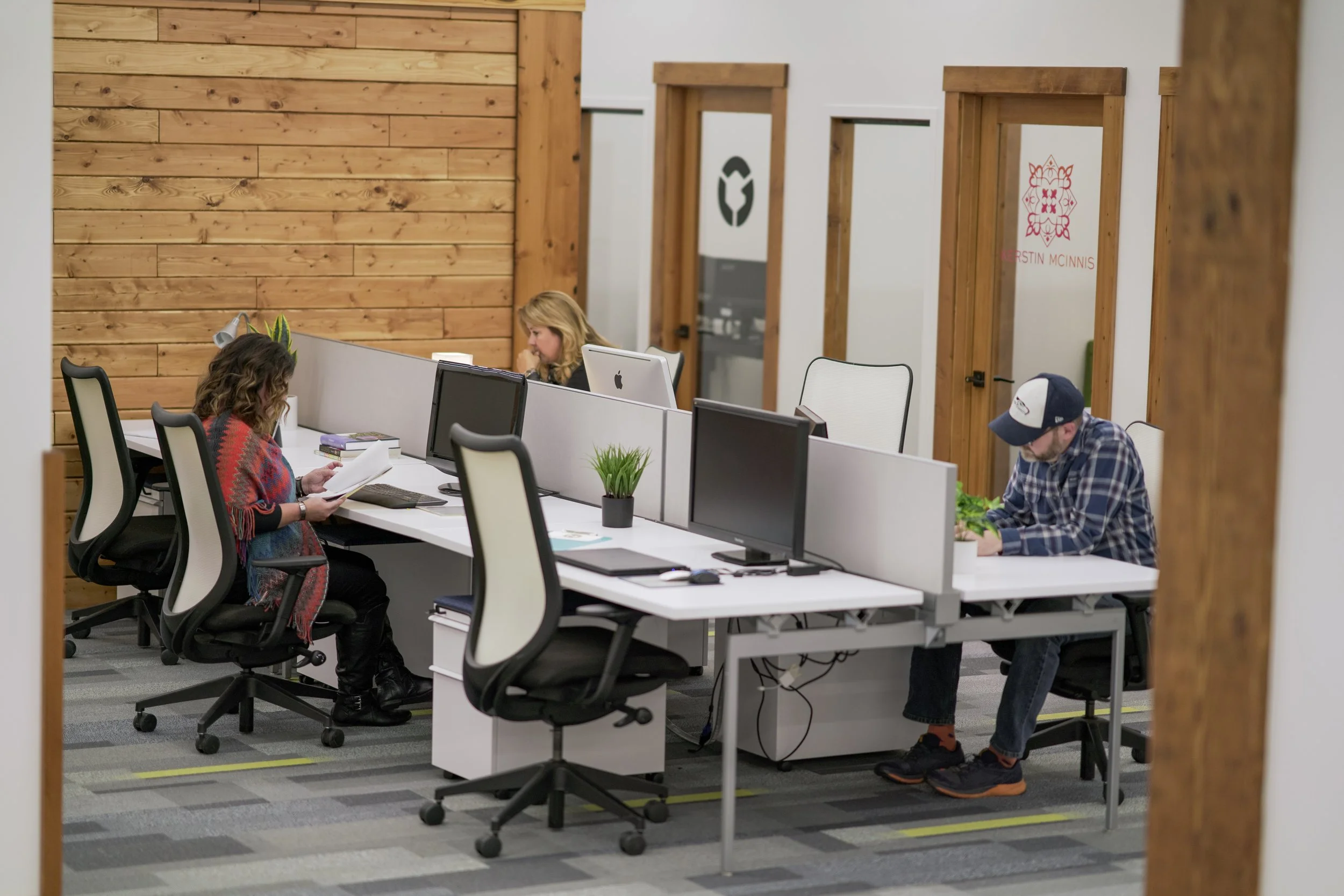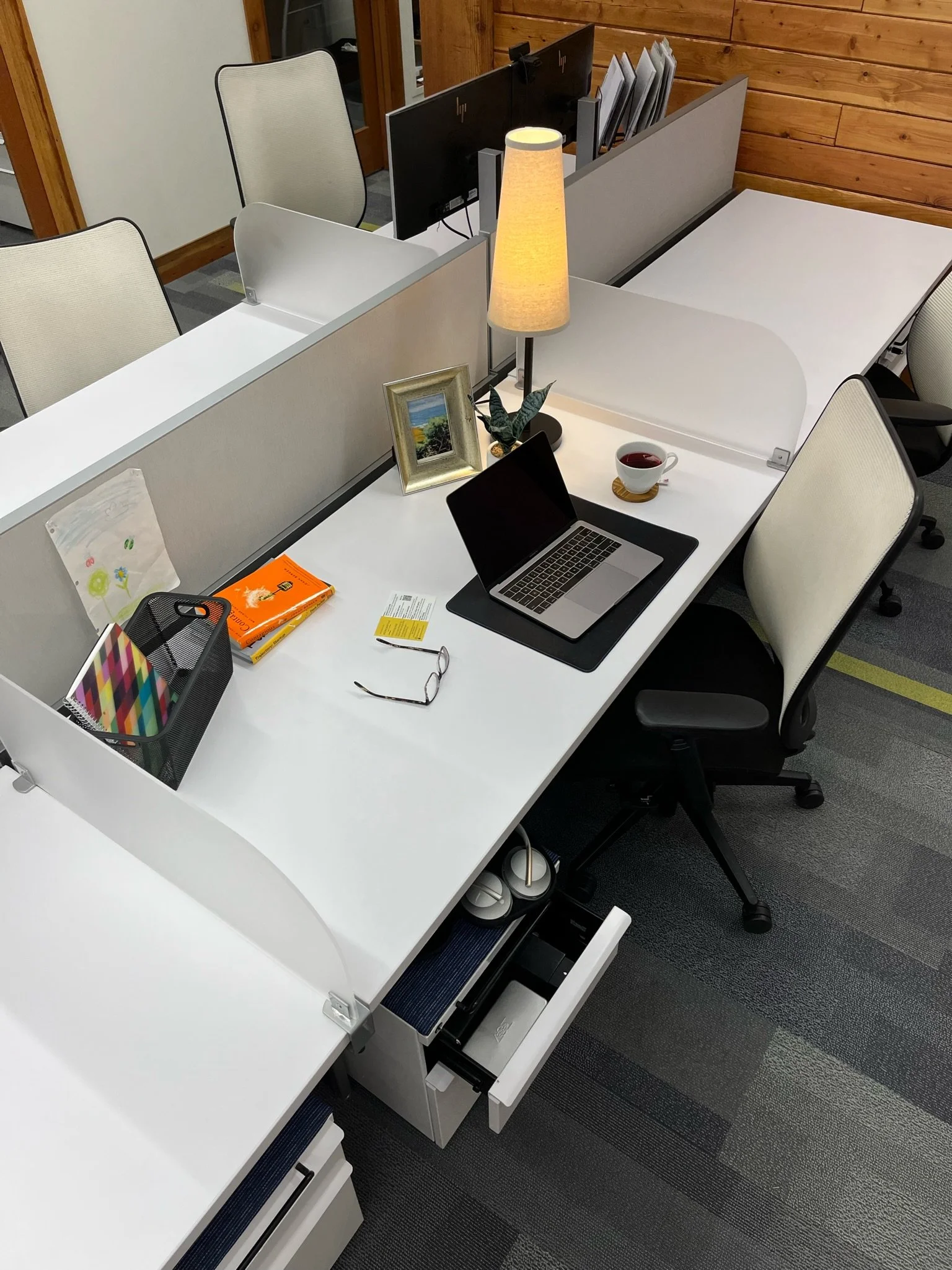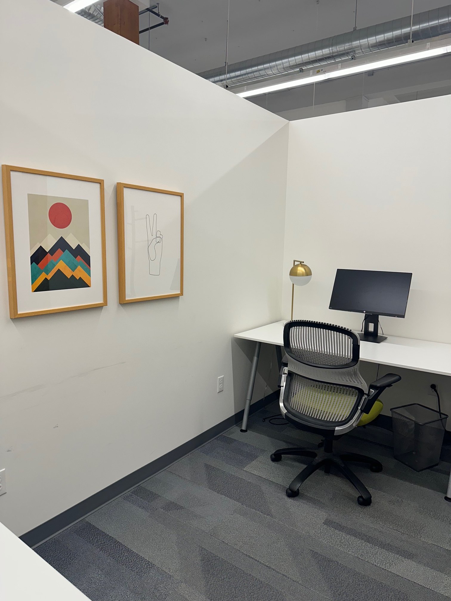 This fixed desk offers a clean, dedicated workspace within a shared, professional environment. Each desk includes a spacious work surface, ergonomic chair, privacy panel, and locking storage. Offered at $295 per month with a 3-month lease term.