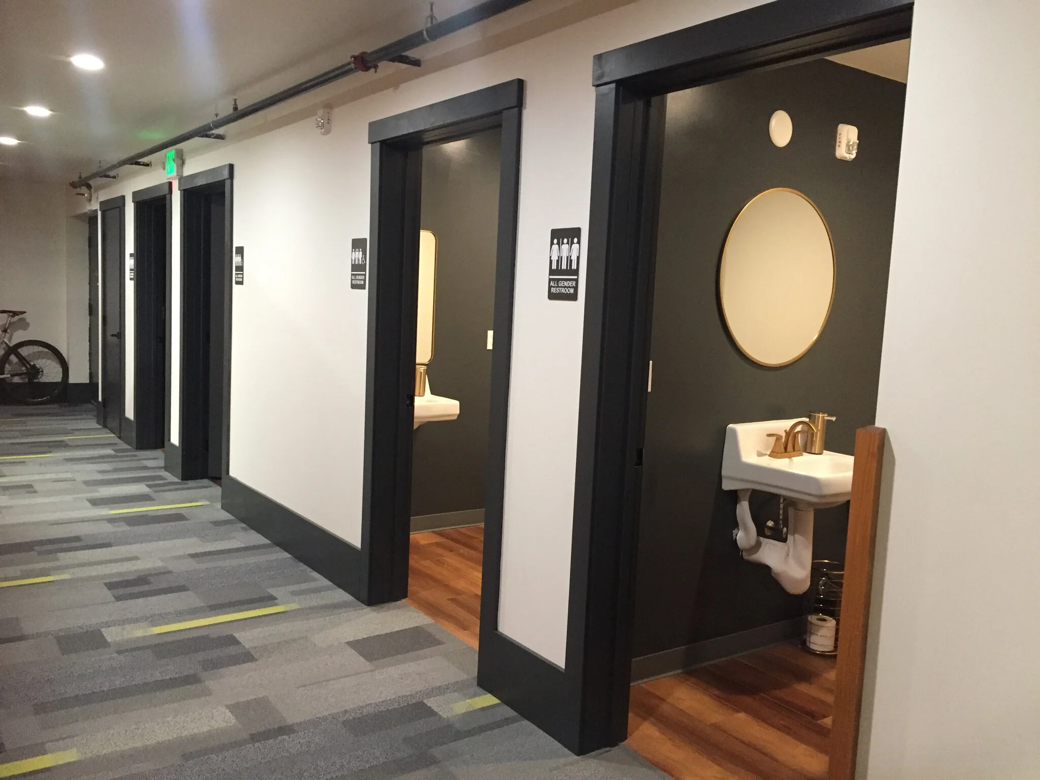 People sitting and talking in a cozy, modern lounge with exposed brick wall and large window.